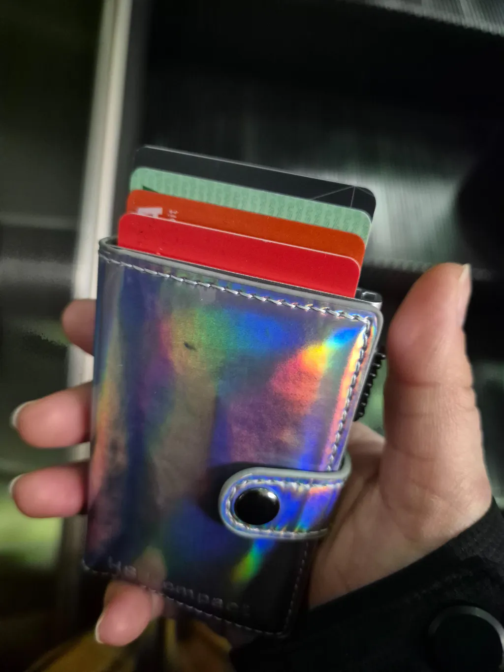 This shiny iridescent wallet shows off with it's sparkling chrome finish. All within a reinforced aluminium non-slip frame that keeps your cards and cash secure as you move (and dance) about.