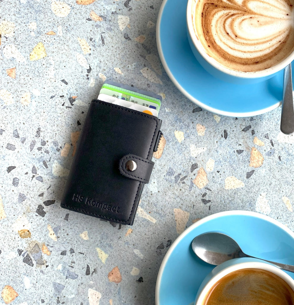 A super sophisticated genuine leather sleeve sets the Premium Kompact Black apart from the rest. Featuring a full skin exterior, this handy little pocket-wallet feels classy and stylish in the palm of your hand.
