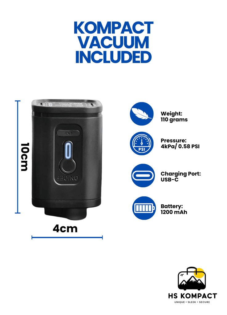 Simply pack as your normally would, then use our Kompact Vacuum suction valve to eliminate excess air. Think of it as a tight hug for you luggage! You'll be amazed how much more you can squeeze into your case. 🤯